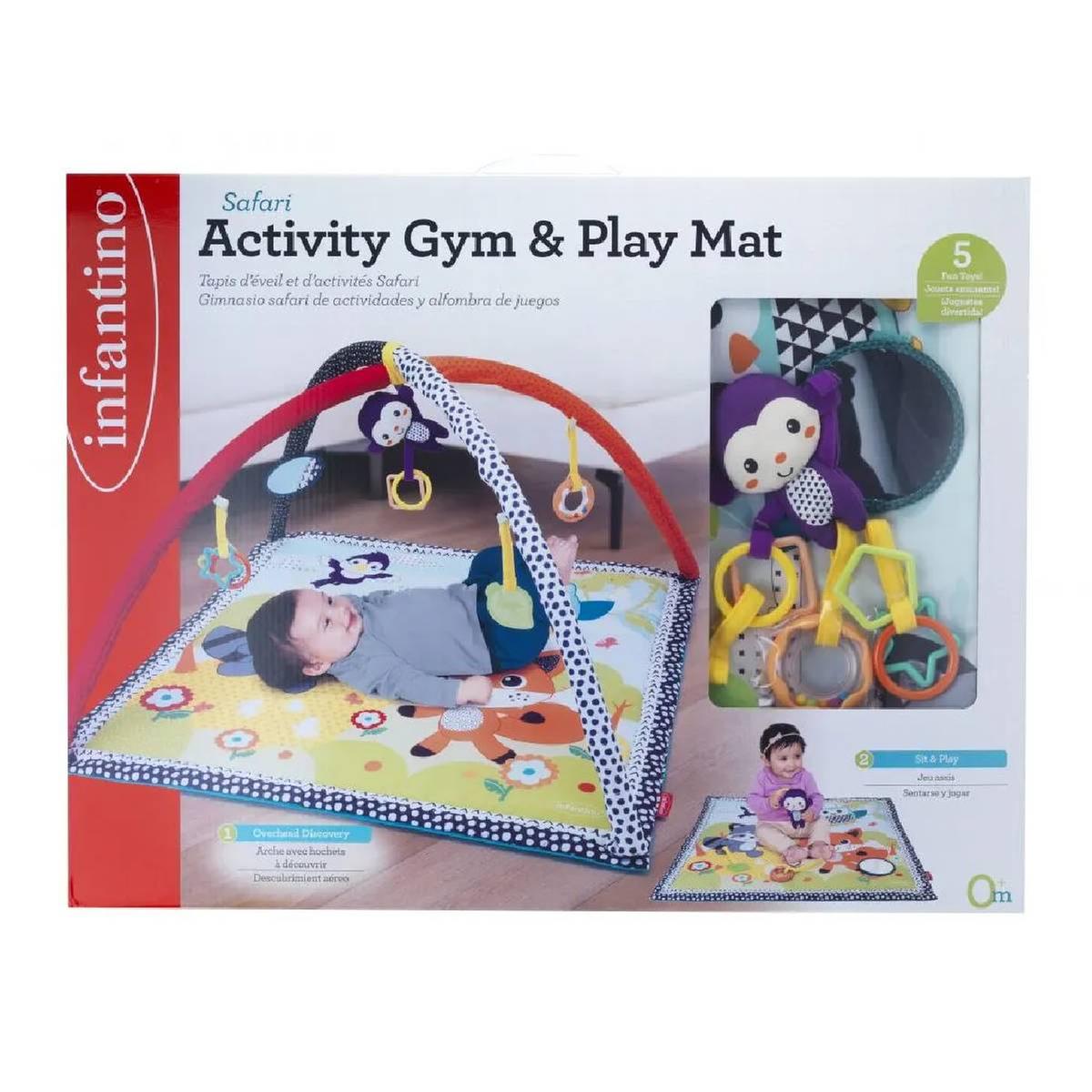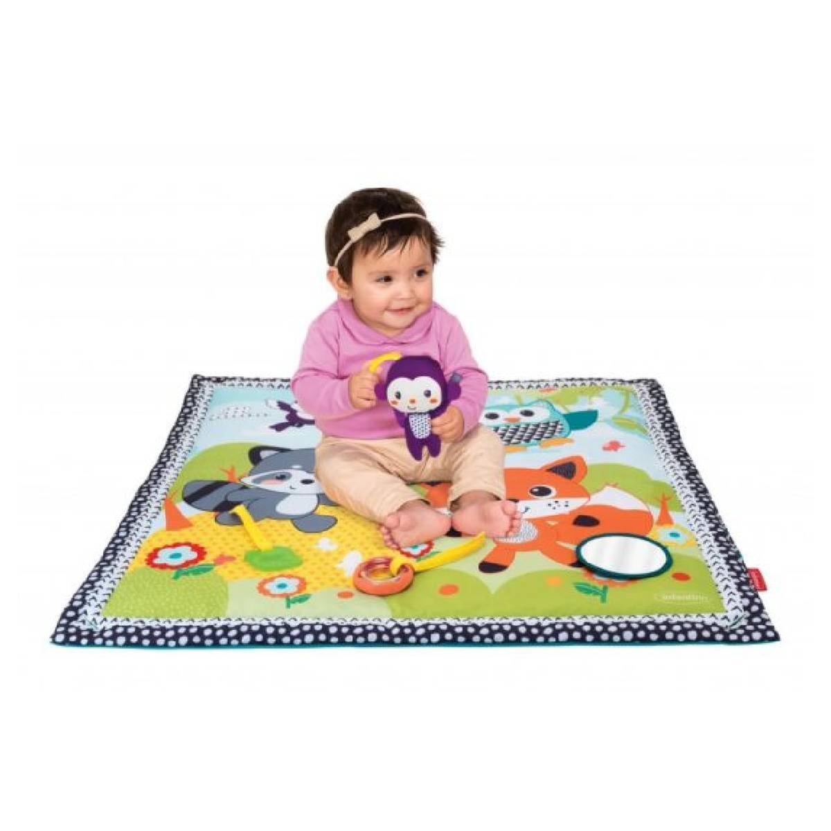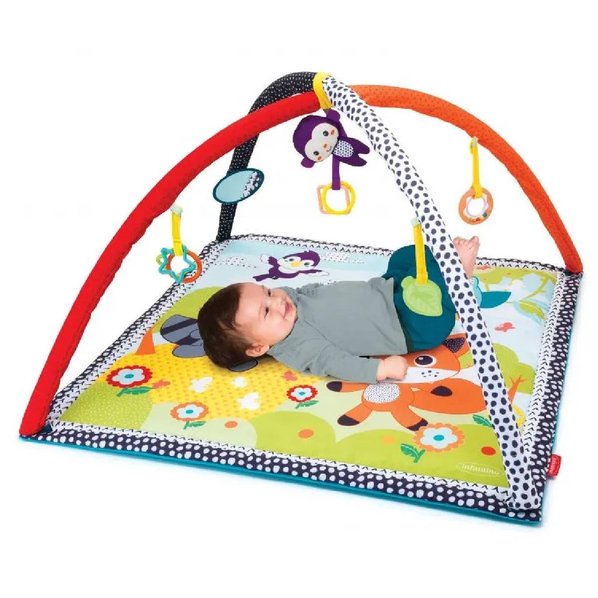 Este gimnasio-colchoneta con texturas y actividades tiene 5 juguetes separables para estimular al bebé: Un monito mordedor, rosquilla sonajero, espejo, hoja mordedor y anillas.